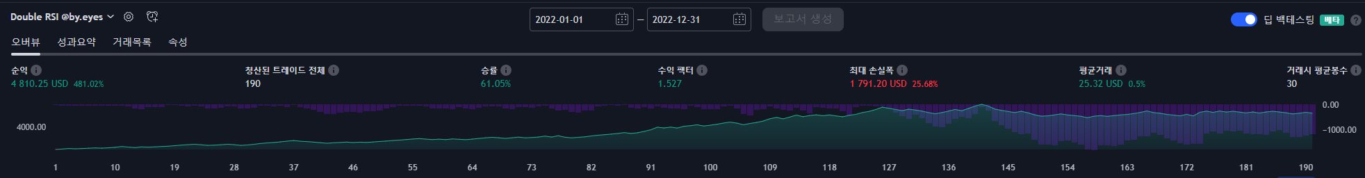 더블 RSI 전략은 2022년 승률은 히든 RSI보다 부족한 승률과 수익률을 보이지만,